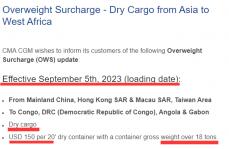 CMA CGM征收亚洲到西非超重附加费OWS 2023.08.29