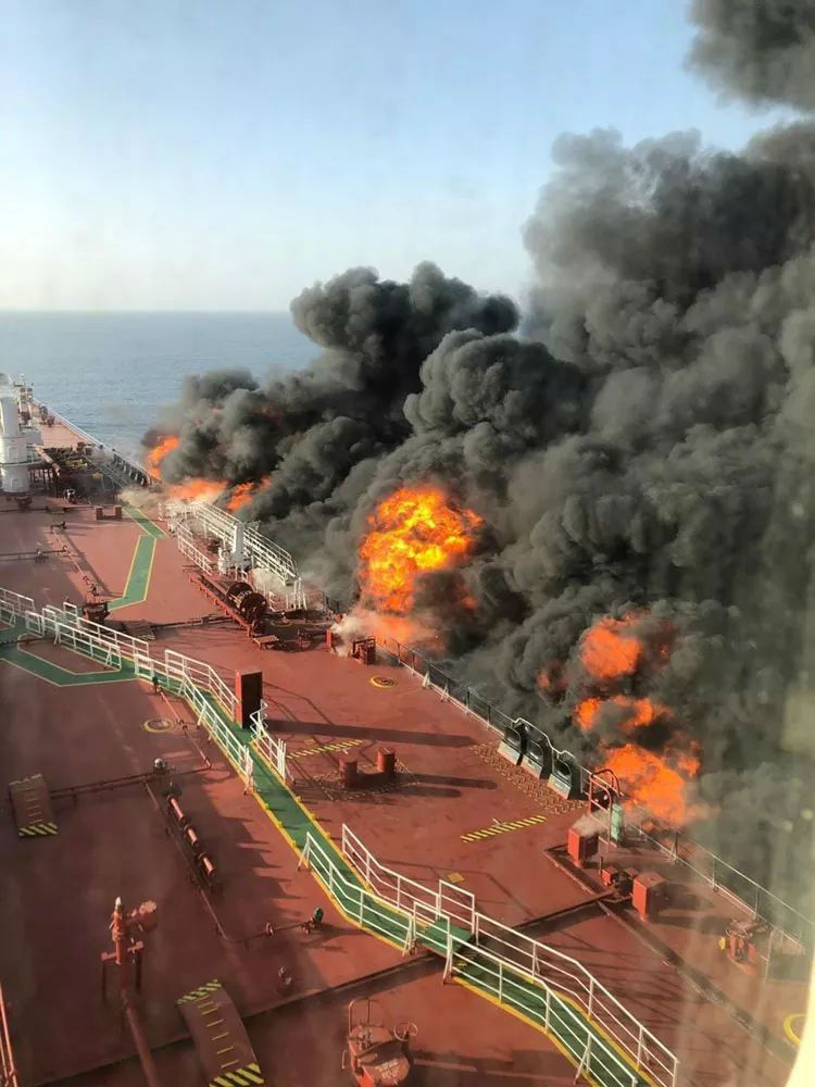6月13日,挪威船东拥有的“前沿牵牛星号”和日本船东拥有的“国华勇气”号油轮,在霍尔木兹海峡入口处的阿曼湾海域,遭遇袭击后发生爆炸,船上燃起大火,船员被迫弃船逃生。美国指责此次袭击系伊朗所为。