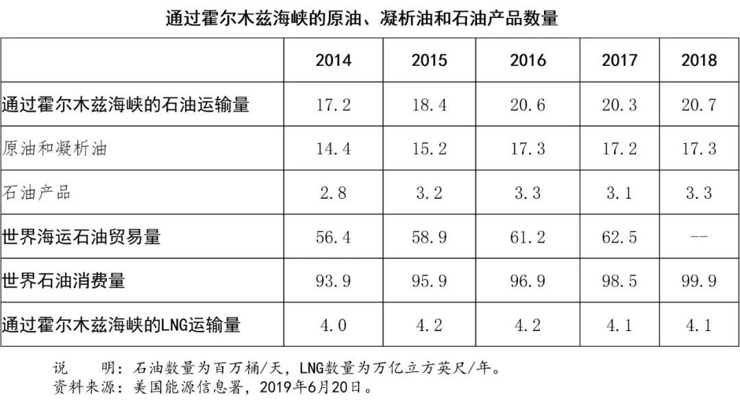 2018年,通过霍尔木兹海峡的日均石油运输量为2100万桶,占全球海运石油贸易的1/3,约等于全球石油消费量的21%。通过海峡的液化天然气数量,占全球液化天然气贸易量1/4以上。