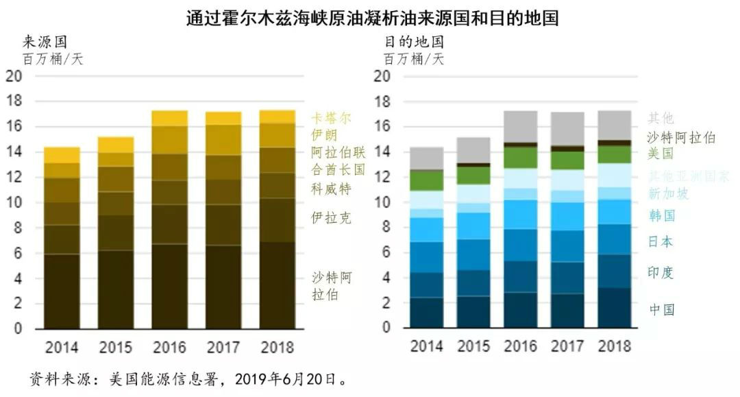 2018年,通过霍尔木兹海峡运输的石油和凝析油中,有76%是运往亚洲市场,中国、印度、日本、韩国和新加坡是主要目的地,这些国家占通过霍尔木兹海峡石油和凝析油通过量的65%。